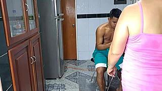 that mature mom is giving a sloppy blowjob to her stepson in the kitchen