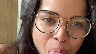 Nerdy busty Brazilian brunette deepthroats Wellington Prado's huge cock in jeans shorts mirror POV.