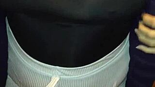 hey check this mature flashing red thong through see-through leggings on street