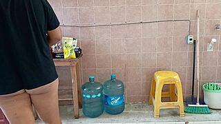 Wow! Chubby Madrastra Scrubs Kitchen Eager for Curvy Fat Ass Pounding!
